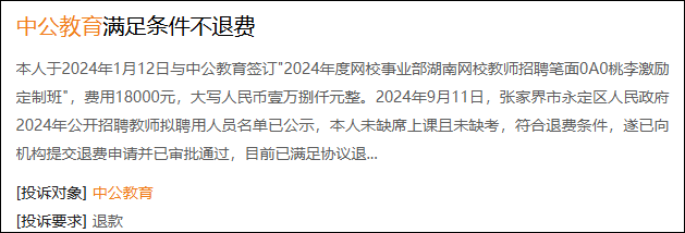 近日✿★★,武汉的刘小姐反映✿★★,为了能够顺利通过考试✿★★,2024年她花2万多元报名参加了中公教育的培训班✿★★,合同中约定✿★★,如果刘小姐未能通过笔试✿★★,中公教育会退费1.7万元✿★★。事后刘小姐没能通过考试✿★★,当她找到该机构时✿★★,对方却说✿★★,可以退费✿★★,但一年只能退款1000元✿★★,这笔费用竟然要17年才能退完✿★★。