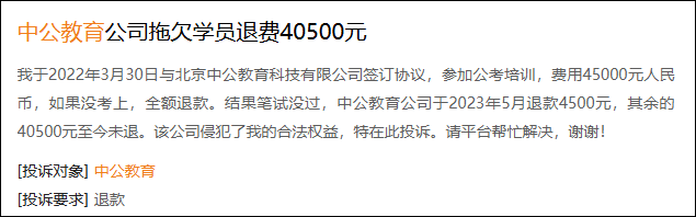 近年来✿★★,中公教育“退款难”问题频出✿★★,记者搜索发现✿★★,仅在黑猫投诉平台✿★★,中公教育的累计投诉就高达13万余条✿★★,其中多数投诉都与拖延退款相关✿★★。